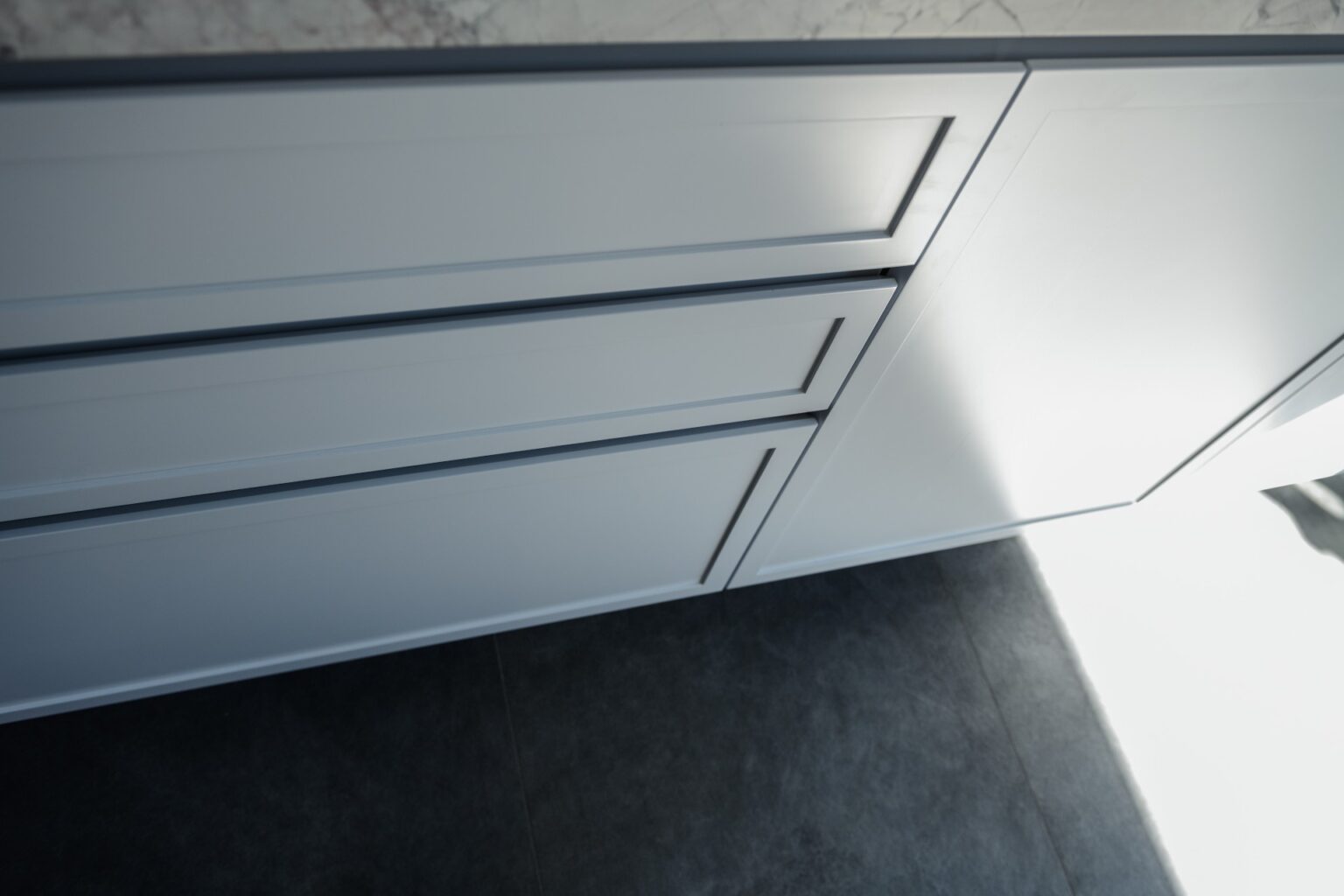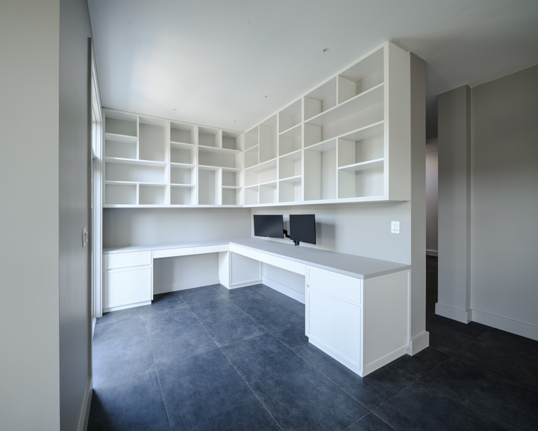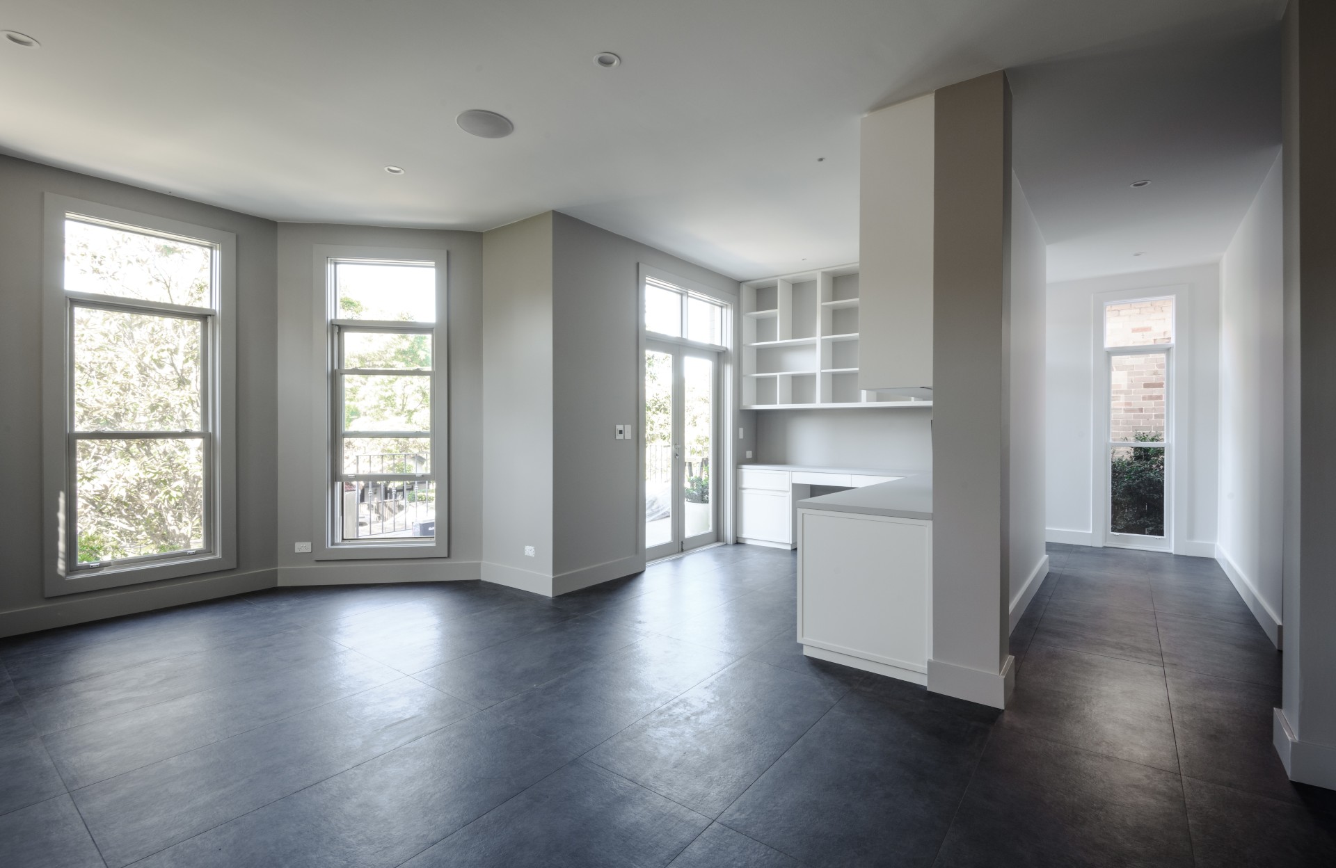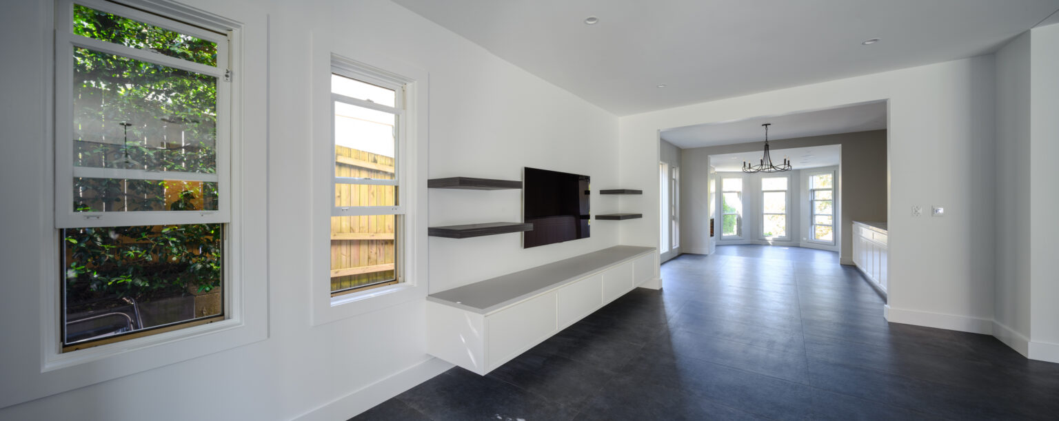 Extensive internal renovations were carried out on the ground floor, including the formal living area, lounge, kitchen and study. The redesign introduced new flooring, windows and doors along with custom-built cabinetry to address the home’s limited storage.