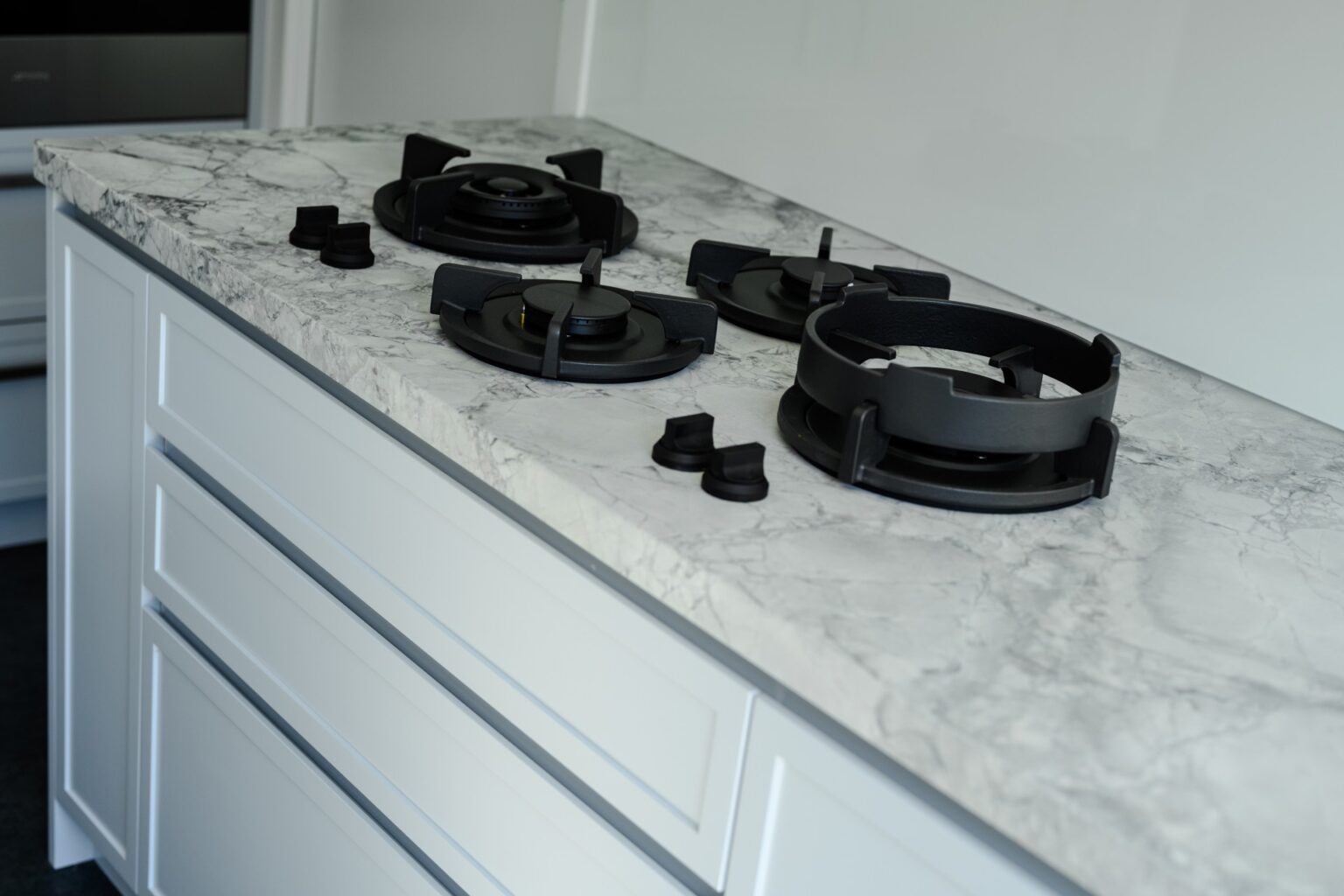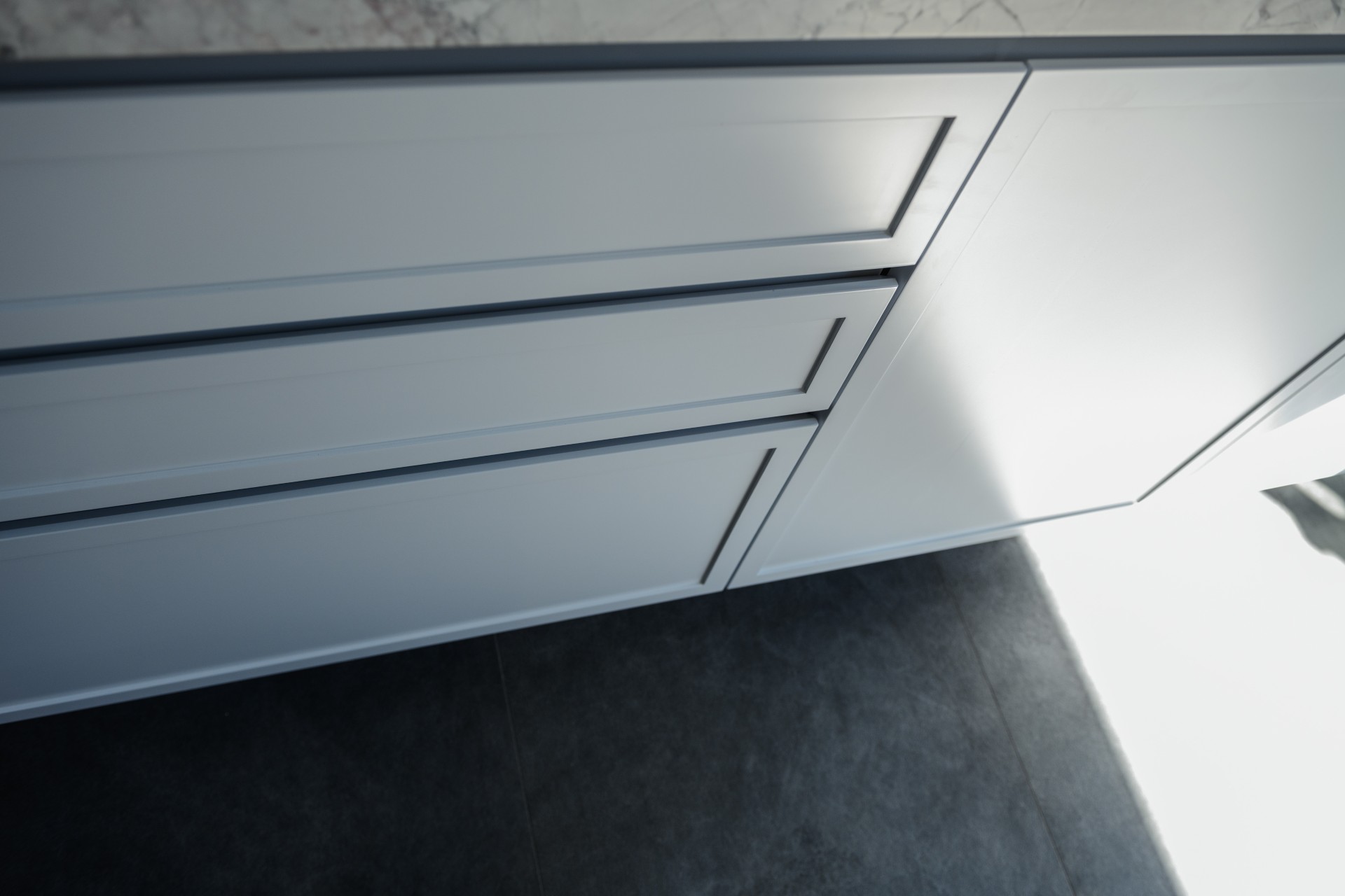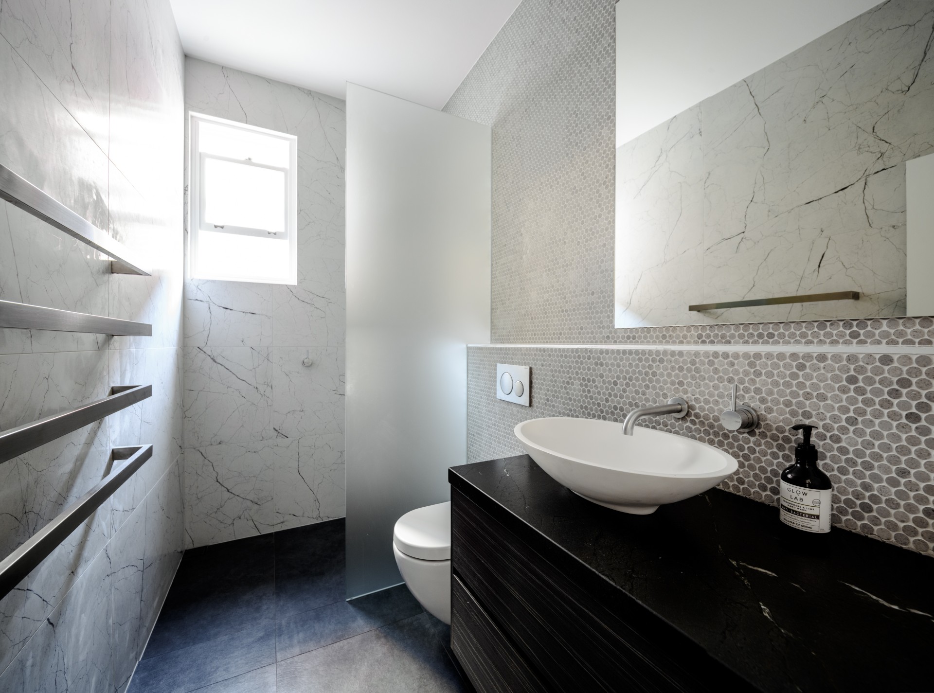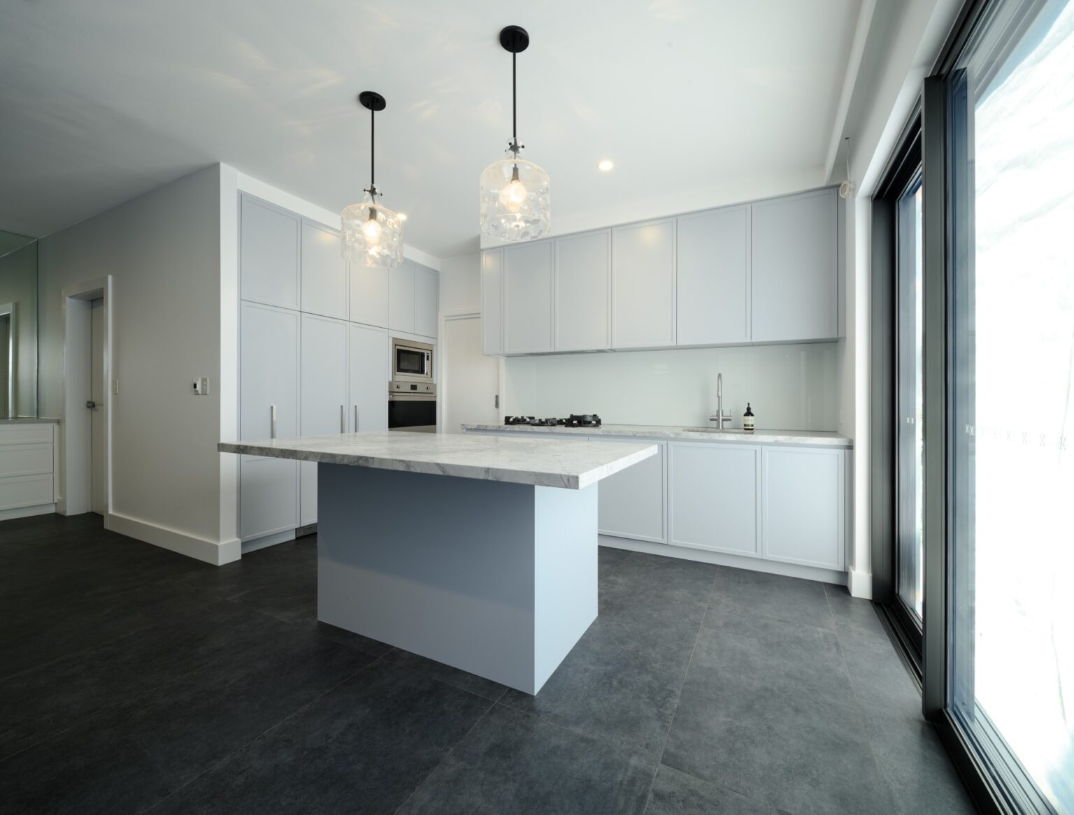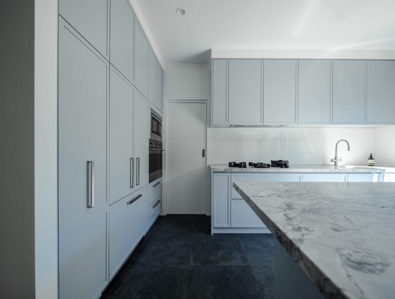 The kitchen was designed with a marble island bench, premium cooking appliances and a soft grey and blue palette complemented by textured shaker-style cabinetry. The bathroom was also fully renovated, with reconfigured plumbing to improve the functionality.