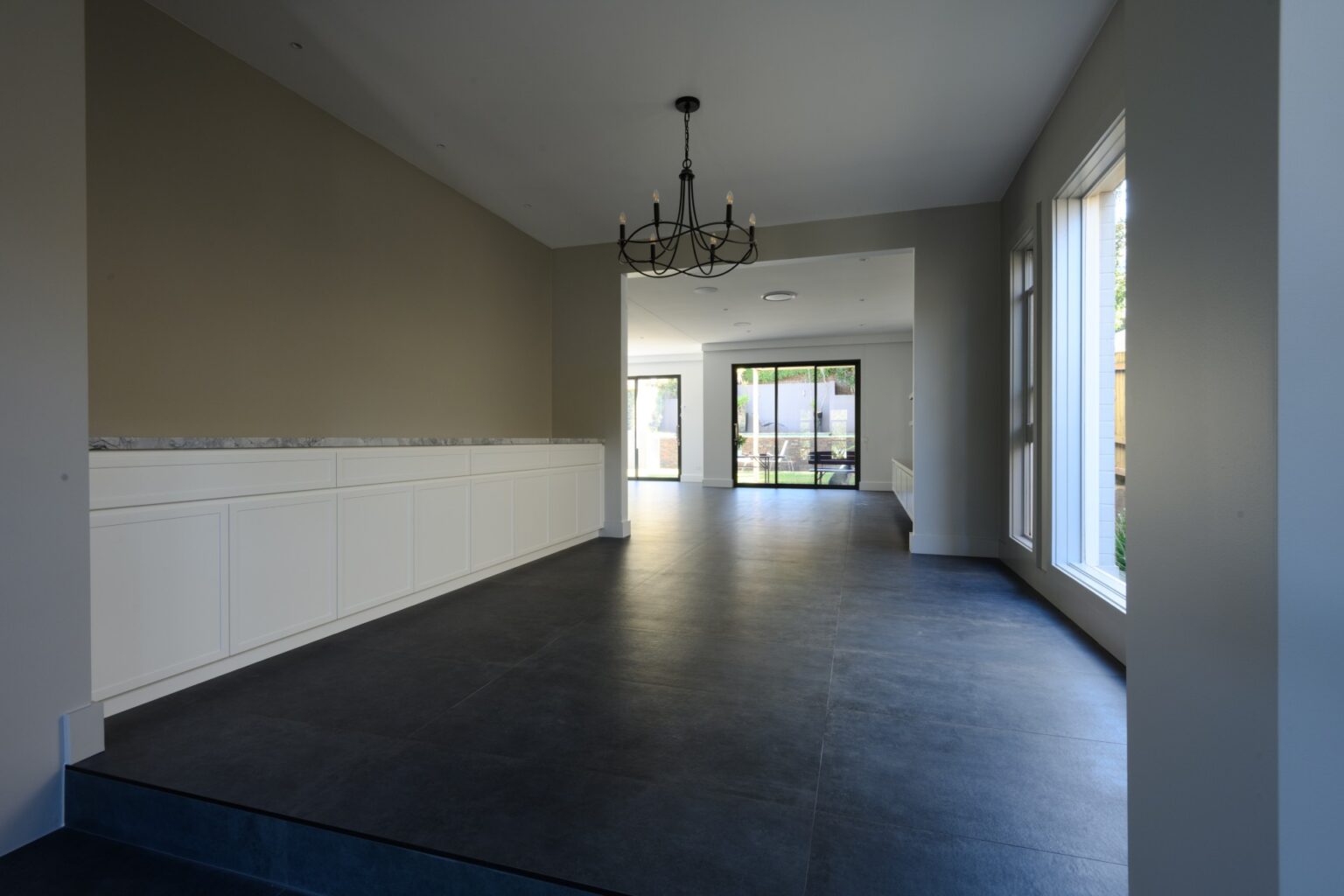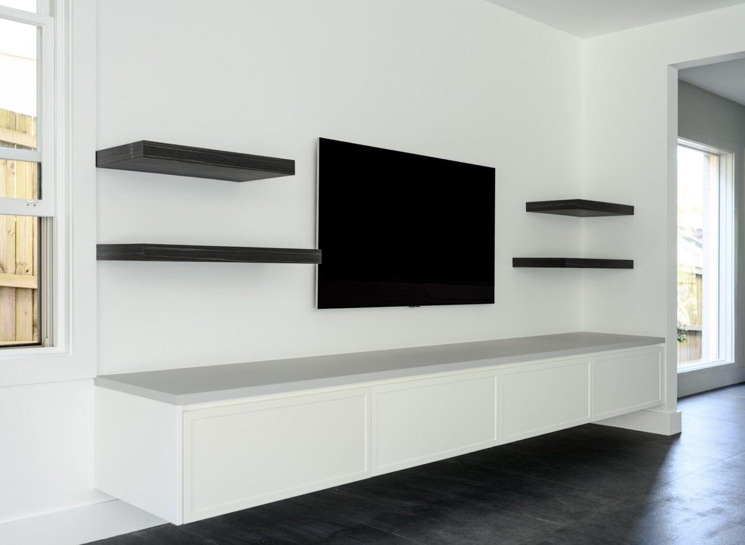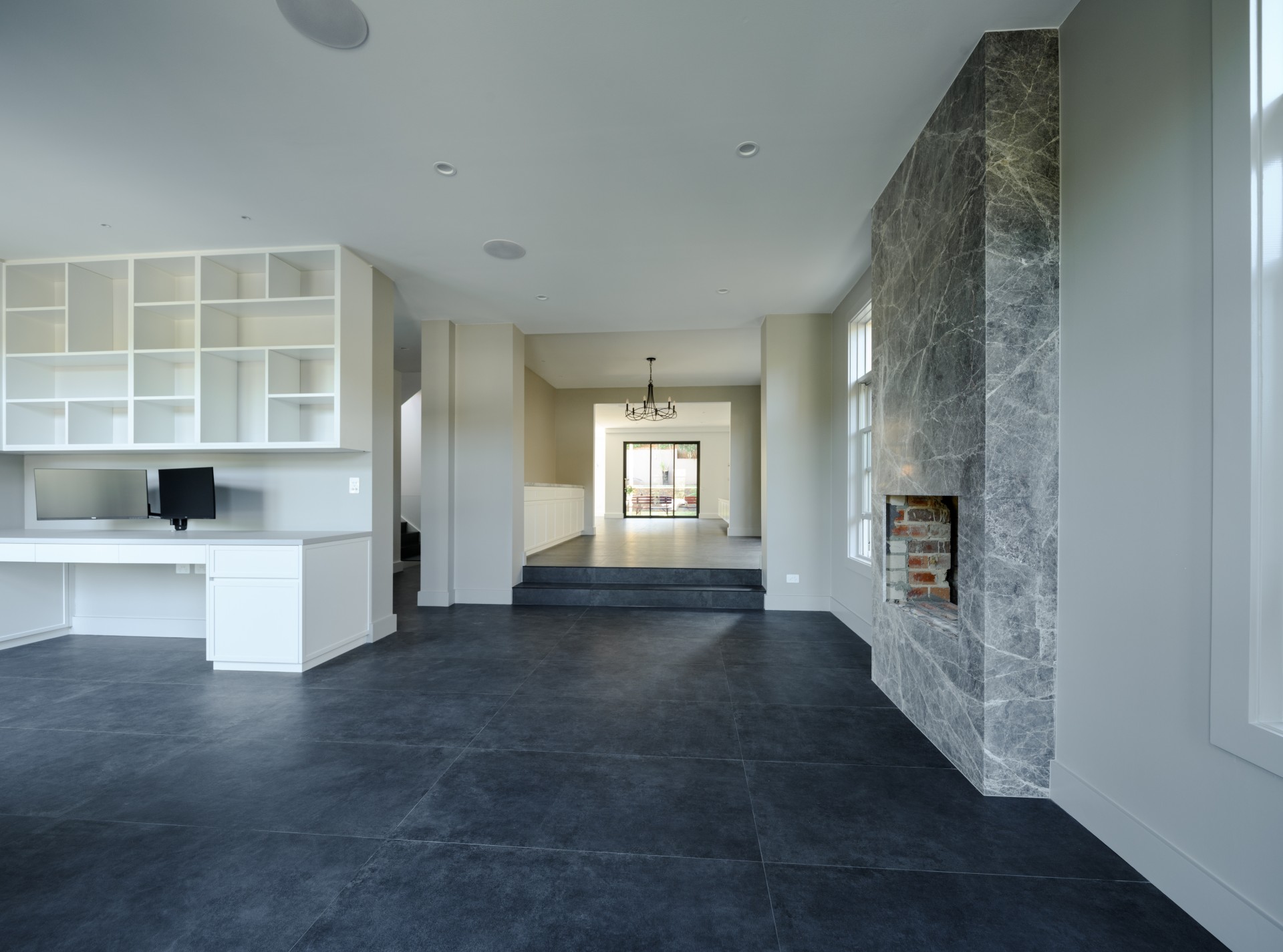 Architectural details included a striking marble fireplace, complemented by bespoke joinery throughout the living areas, featuring long benches, cupboards and a contemporary TV unit for an organised and modern look.