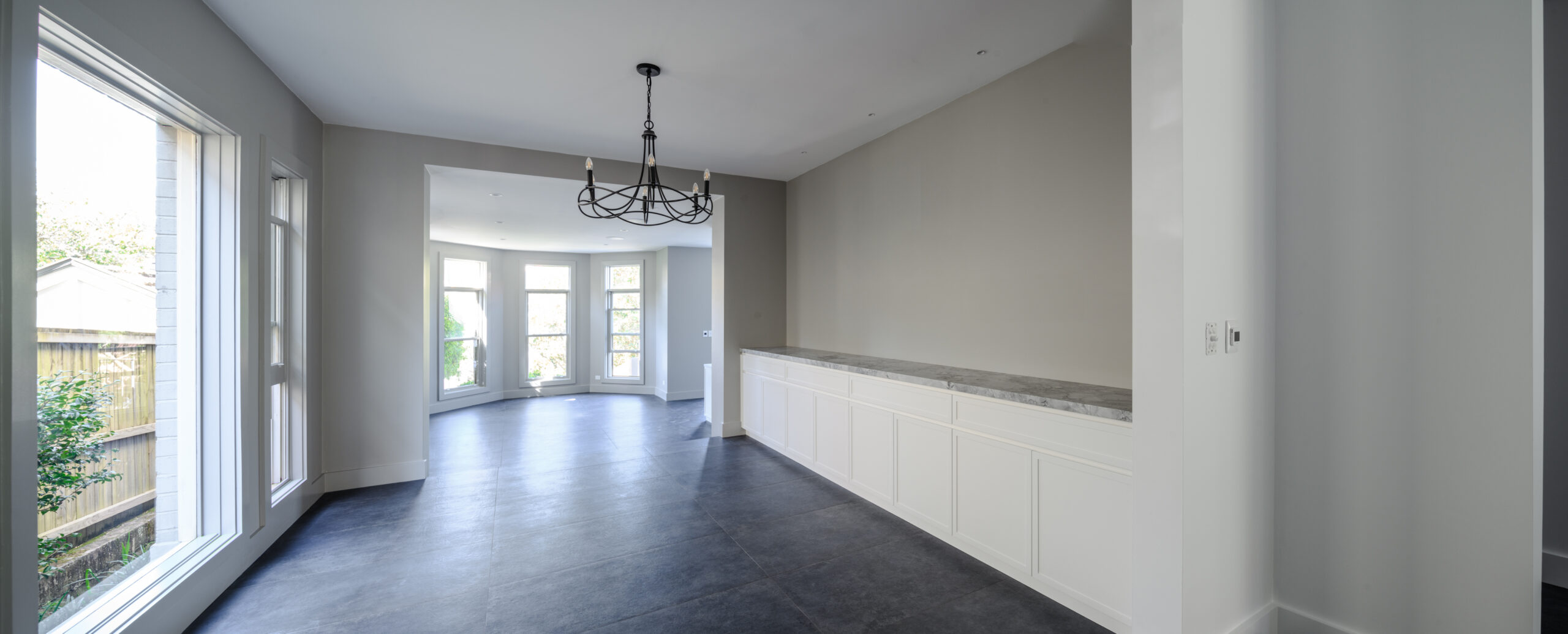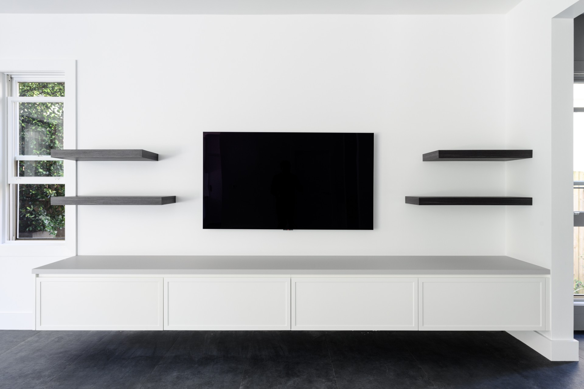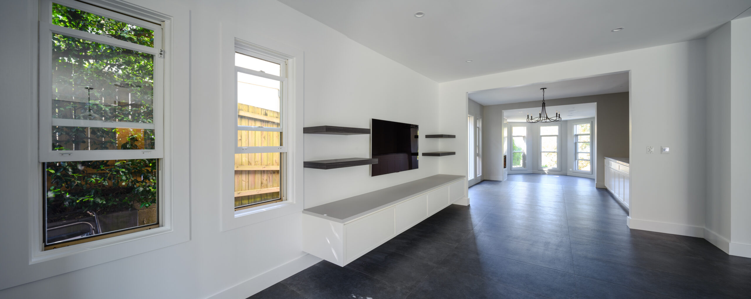 Architectural details included a striking marble fireplace, complemented by bespoke joinery throughout the living areas, featuring long benches, cupboards and a contemporary TV unit for an organised and modern look.